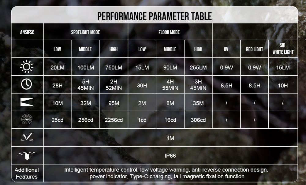 MINIX5 has a spotlight with a maximum lumens of 750 lumens, a maximum range of 95 meters, a floodlight with a color temperature of 4000K, a color rendering index of 95CRl, and has lighting modes such as red light, red flash warning light, and ultraviolet light.