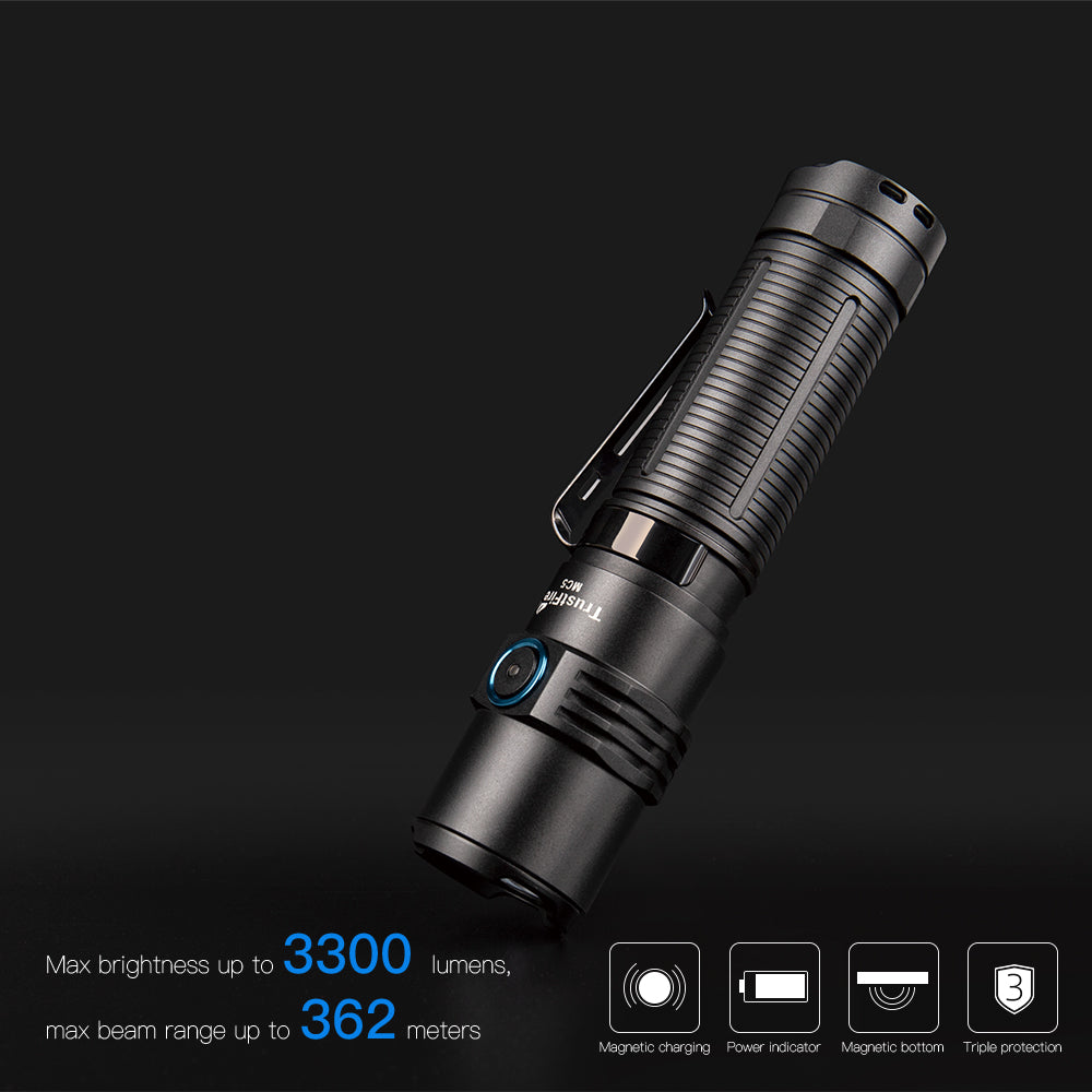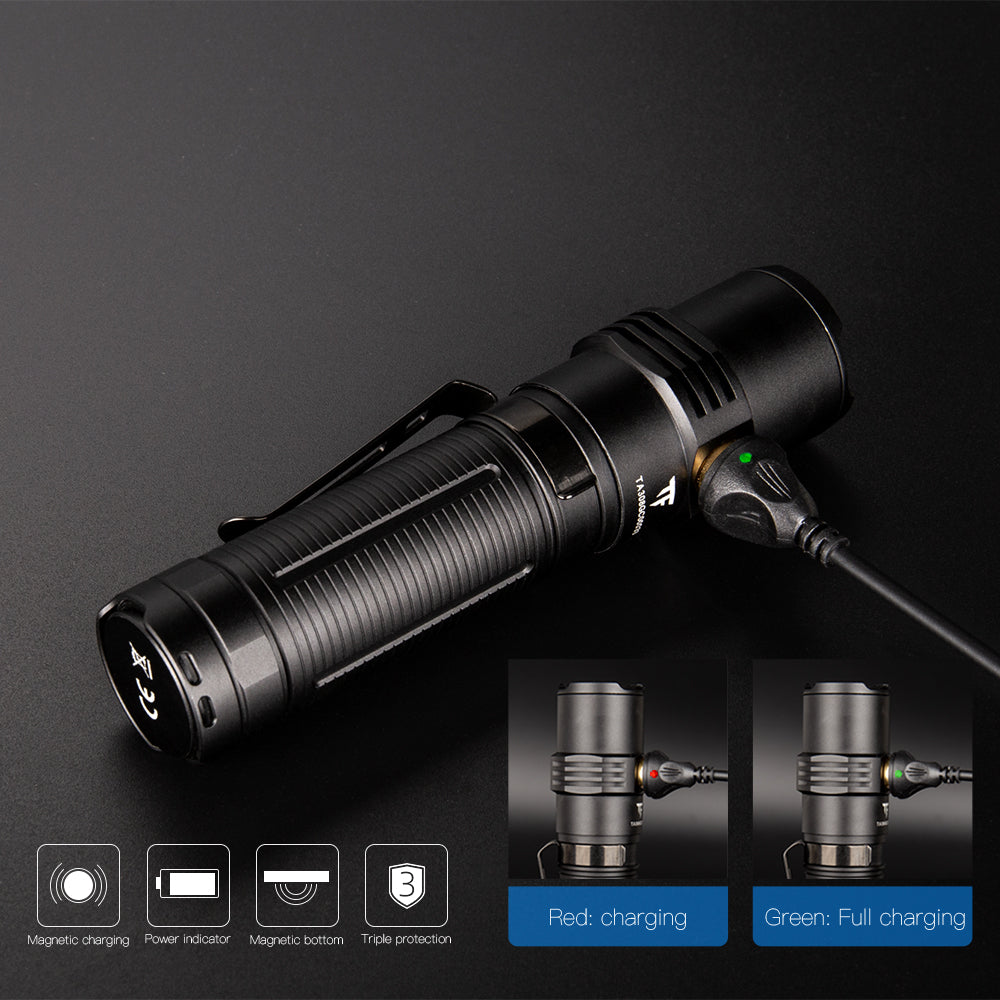 Features: Maximum 3300 lumens of strong white light, using IMR217005000mah battery, magnetic charging, tail magnetic suction, lamp cup design, longer range